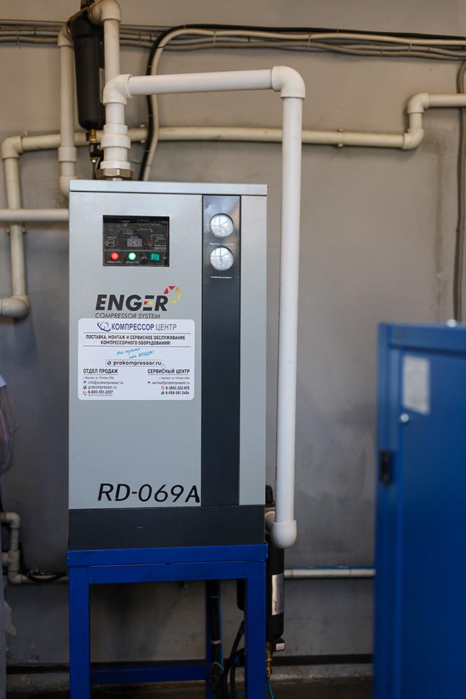 Корректная работа генератора азота предъявляет высокие требования к сжатому воздуху. Он должен быть абсолютно чистым, без любых примесей. Поэтому безмасляный компрессор "Enger" "Enger" OFS-37 A 10 PM VSD идеально подошел для этой задачи. Дополнительно в линию установлен рефрижераторный осушитель «Enger» RD-069A с постоянной точкой росы +3 градуса Цельсия и магистральные фильтры этого же бренда на 1 микрон, 0.1 и 0.01 микрон.