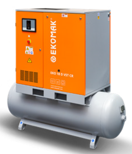 Маслозаполненные винтовые компрессоры Ekomak серии EKO D VST CR оснащены редукторной передачей, которая позволяет передавать крутящий момент ещё более эффективно, чем привычный прямой привод. Блягодаря такой компановке и частотному преобразователю значительно сократилось энергопотребление и увеличилась производительность. Также на все модели устанавливается винтовой блок Atlas Copco, отличающийся высокой надёжностью и качеством работы. Благодаря такой компановке, уровень шума компрессора составляет 63 дБ. Компрессор комплектуется двигателем IE3 класса F со степенью защиты IP55. В сборку также входят ресивер на 500 литров. Серия EKO D VST CR дополнительно оснащается удобным и интуитивным контролером управления, фильтром сжатого воздуха, влагоотделителем и маслоотделителем.